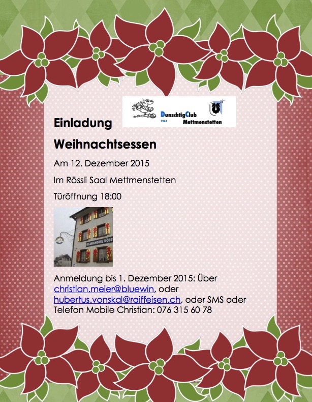 Wir laden euch und eure Partnerinnen zum Weihnachtsessen des Dunschtigclub Mettmenstetten ein.